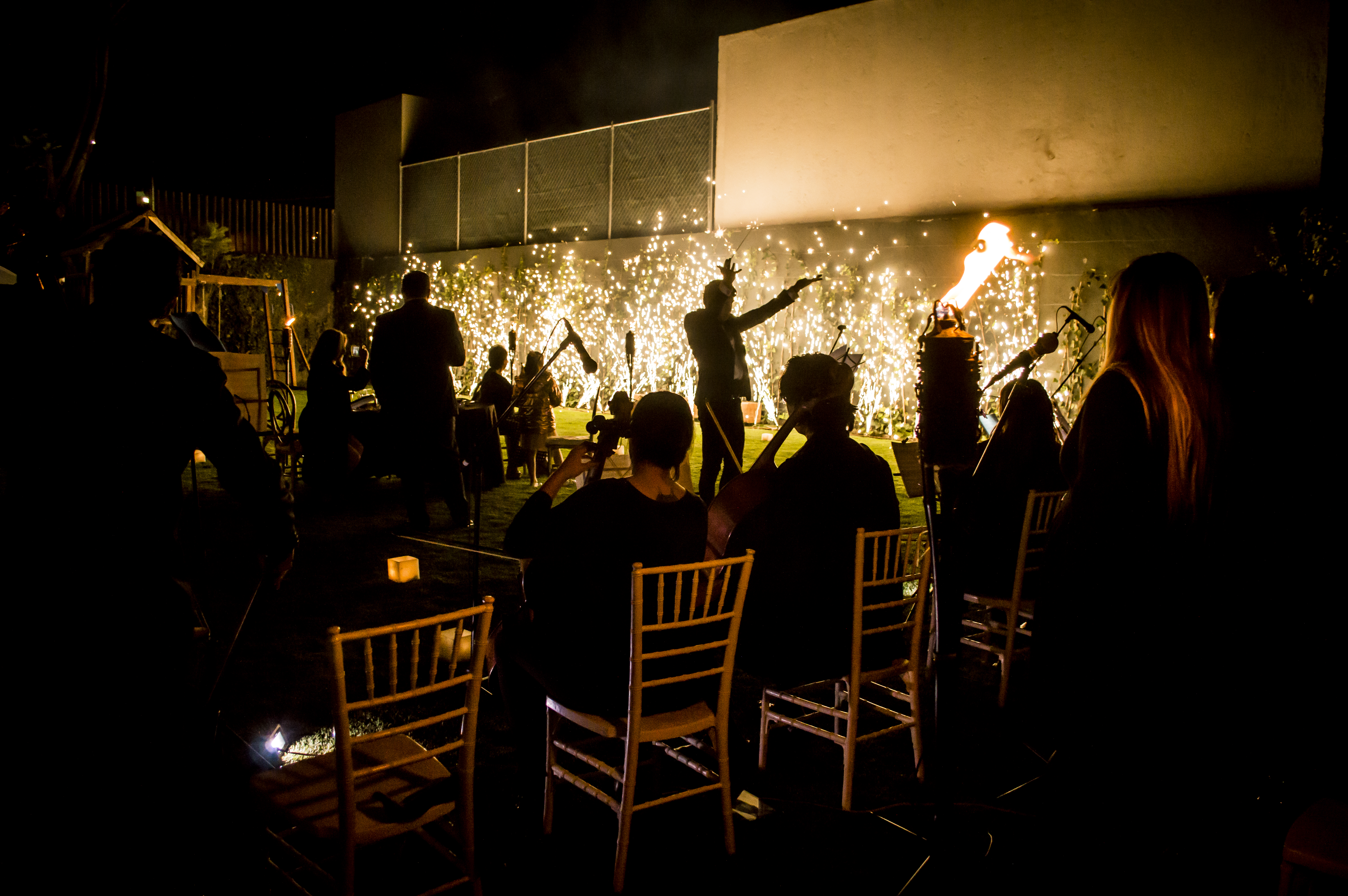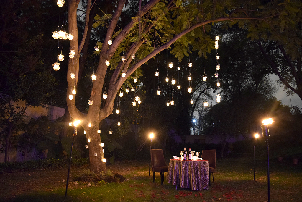 Un camino de antorchas los guía a un extraordinario jardín donde caen velas flotantes. El sonido de un saxofón los acompaña en esta noche especial y para terminar, una cortina de pirotecnia seduce la velada.