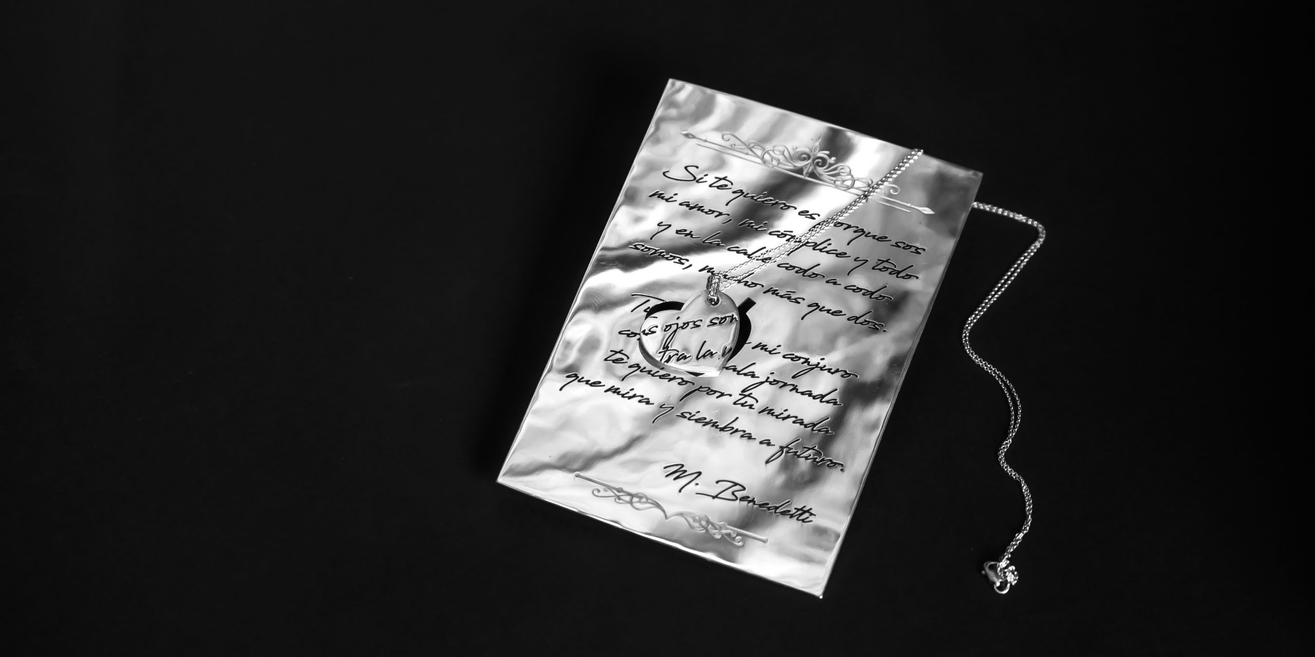 Una placa de material precioso que captura la carta perfecta de la cual se desprende un dije inconexo que solo vuelve a cobrar sentido cuando se coloca de vuelta en la placa. Un misterio íntimo que solo ustedes dos comparten.